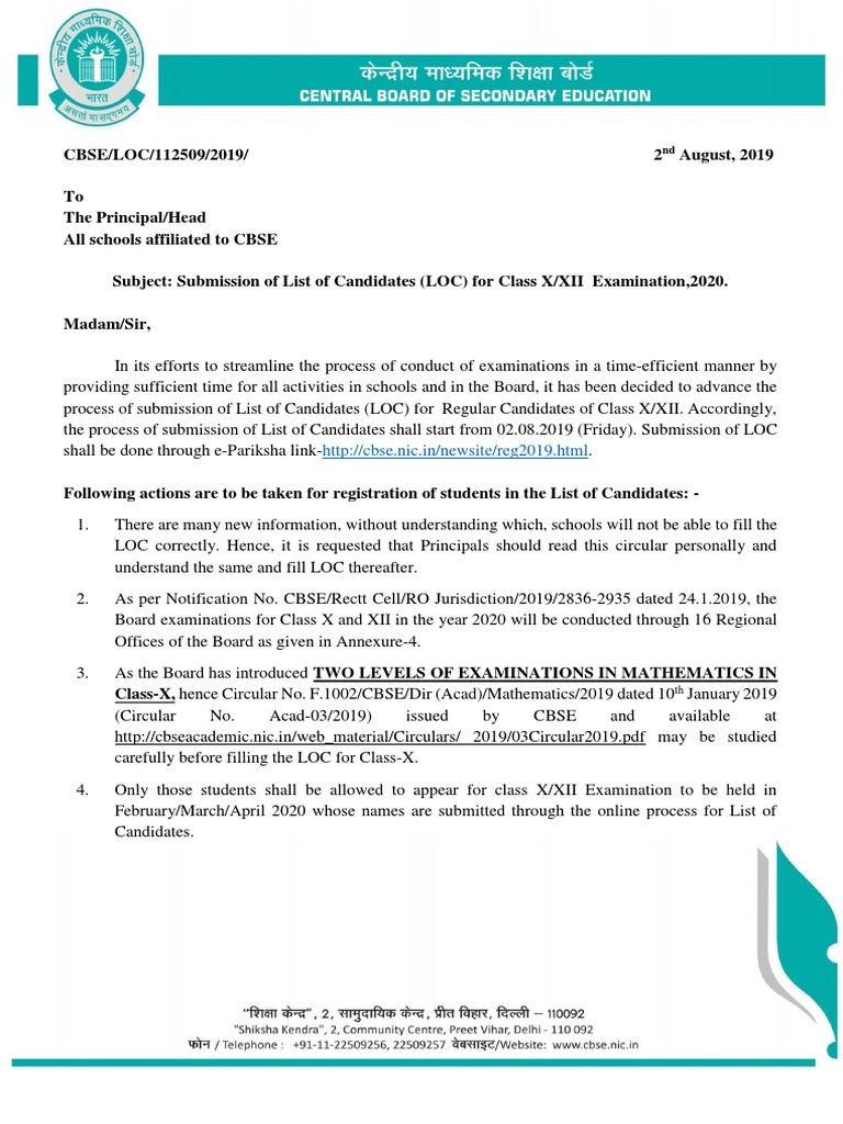 Madam sir in its efforts to streamline the process of conduct of examinations in a time efficient manner by providing sufficient time for all activities in schools and in the board it has been decided to advance the process of submission of list of candidates loc for regular candidates of class x xii. Submission of list of candidates loc for class x xii examination 2020. The central board of secondary education cbse has started the online submission of the list of candidates loc for class 10 and class 12 board exam 2019.